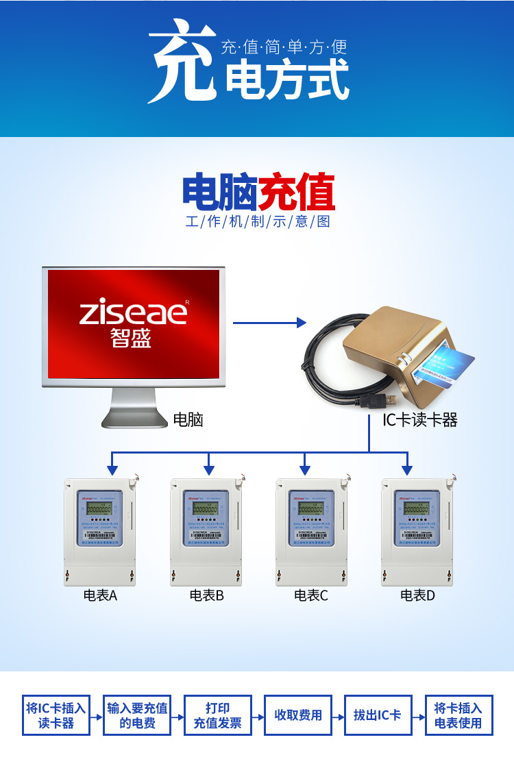 (二)充電方式:三相預付費電度表(公用表)的充值系統安裝到電腦上,讀卡器連接電腦的USB進口,就可以實現對電表IC的充值,充值成功后用戶就可以插電表使用了,可實現一表多卡和多表多卡的功能。(具體操作的書面教程和視頻教程可進入官網查看)