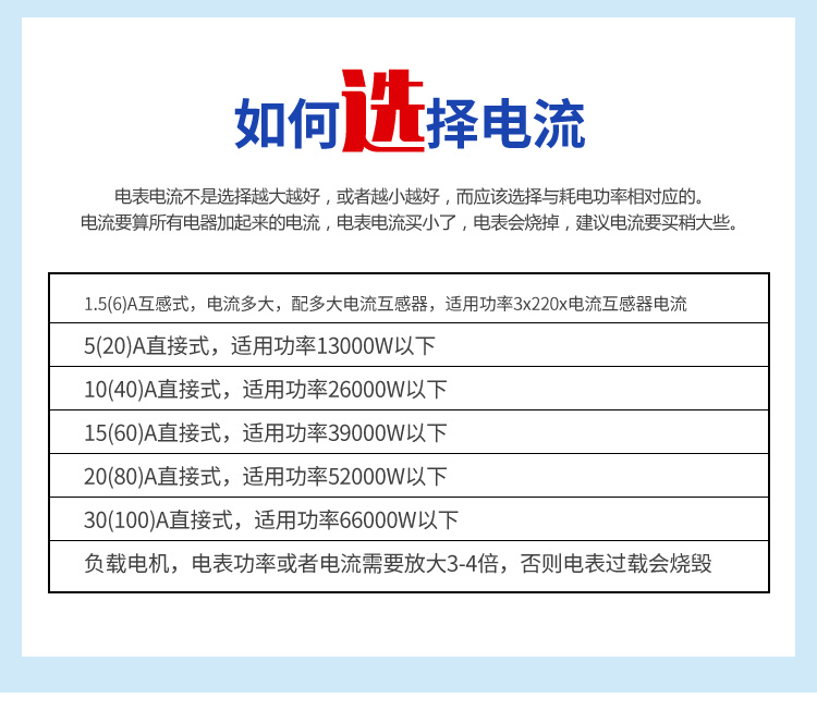 (五)三相預付費電度表(公用表)的選型:電表電流不是越大越好,或者越小越好,而應選擇與使用功率相對應的預付費電表,具體如下