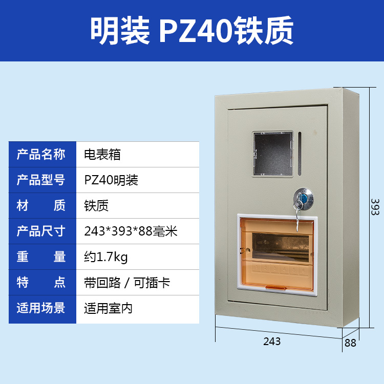 我公司生產(chǎn)的PZ40電表箱采用0.5-1mm厚冷軋鋼板和進口PC高透視窗,并帶有門鎖,安全防盜,大氣美觀。可安裝各類電能表和C45、空氣開關(guān)、斷路器閘刀等,廣泛用于家庭、公寓、學(xué)校、工廠等場所。